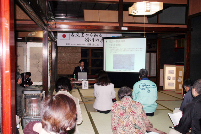 講師には滑川市立博物館の学芸員近藤浩二氏による、テーマを「古文書から知る滑川の歴史」としたまちづくり講演会である。