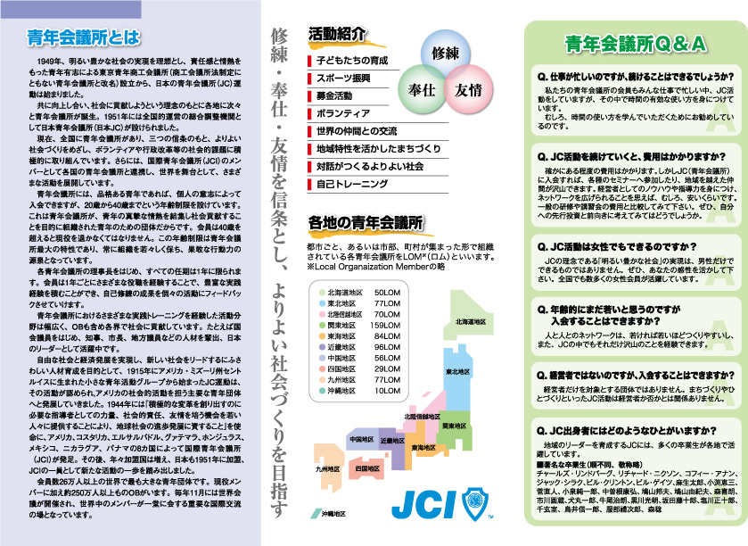 我々は活動していく中で、本来のJCとは何かを今一度考えていかねばならない時期に来ている。JCはボランティア団体とか錯覚してしまうが、決してボランティアをするために活動をしているのではない。より良いまちをつくるために、手段としてボランティアなどを行っているということを忘れてしまいがちである。本当は今のうちにもっと学ばなければいけないことが山ほどある。