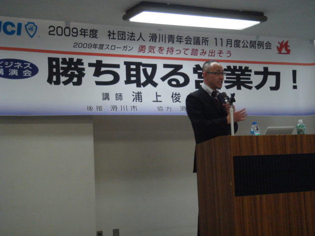 講師に浦上俊司氏をお招きし、ビジネス講演会として「勝ち取る営業力!」をテーマに講演いただく。講師は、関西(兵庫県姫路)人ならではの話のテンポと、標準語をうまく取り入れた聞きやすい講演であった。