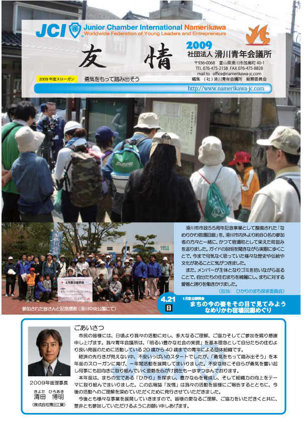本日は、社団法人滑川青年会議所の2009年度年間事業報告ということで、市民向け広報誌「友情」が市内全世帯に配布されます。