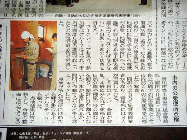 JCで培ったノウハウを活かし、事業を企画し当日を迎えた。私の業界は管工事業であるが、簡単にいえば「水道屋さん」である。その組合の青年部で市内公園の公衆便所を点検、そして節水を呼び掛けるステッカーを貼り節水を市民に対して呼び掛ける。