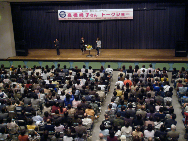 トークショーということで対話形式となったが、お相手にはKNB(北日本放送)の木下一哉アナウンサーと高橋尚子さんのトークショーが始まる。会場は少しでも前で見ようとする方々が開場2時間前より長蛇の列をつくっていた。天候も良くなったので主催者も予定開場時間より早く開場をせざるを得なかった。会場は最後列の席まで埋まり満員(推定1000人)。Qちゃん人気は衰えることを知らない。