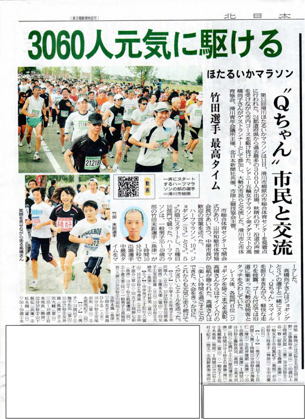 本日は、滑川ほたるいかマラソンの本番。「できるだけ多くの方と触れ合いたい」といわれるように、多くの参加者や応援している人に元気や勇気をあたえてくれそうだ。