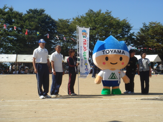 昼食から午後の競技にかけて来年の富山県で開催される全国スポレク祭のマスコット「きときと君」が来場。子どもたちが群がっていた。
