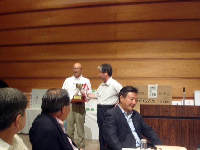 開会後、順位が発表された。そして上位3名が第3位から準優勝、優勝の順に表彰された。第3位は、富山県議会議員賞ということで神田真邦県議より成瀬郁夫氏に贈られた。第2位は、滑川市議会議長賞で砂原孝議長より杉田勝正氏に。そして、優勝は滑川市長賞、北日本新聞杯ということで、優勝カップ、そして市長賞である液晶テレビが優勝者の石坂泰三氏に贈呈された。 この後砂原議長の乾杯で懇親会がはじまり、お互いの成績などをつまみに盛り上がった。