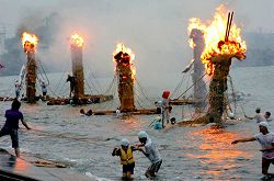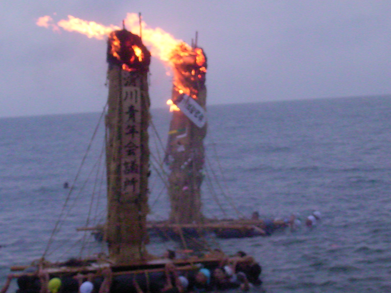 午後六時半、海岸に集まった七町内会と寺家小、滑川青年会議所などの松明計十基が一斉に点火され、若衆らが海に担ぎ入れた。青竹が破裂音を上げて火の粉を散らすたびに、見物人から歓声が上がった。(中日新聞)
