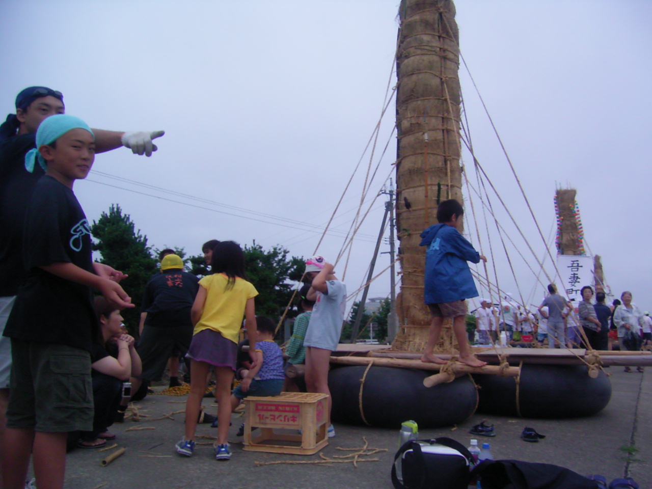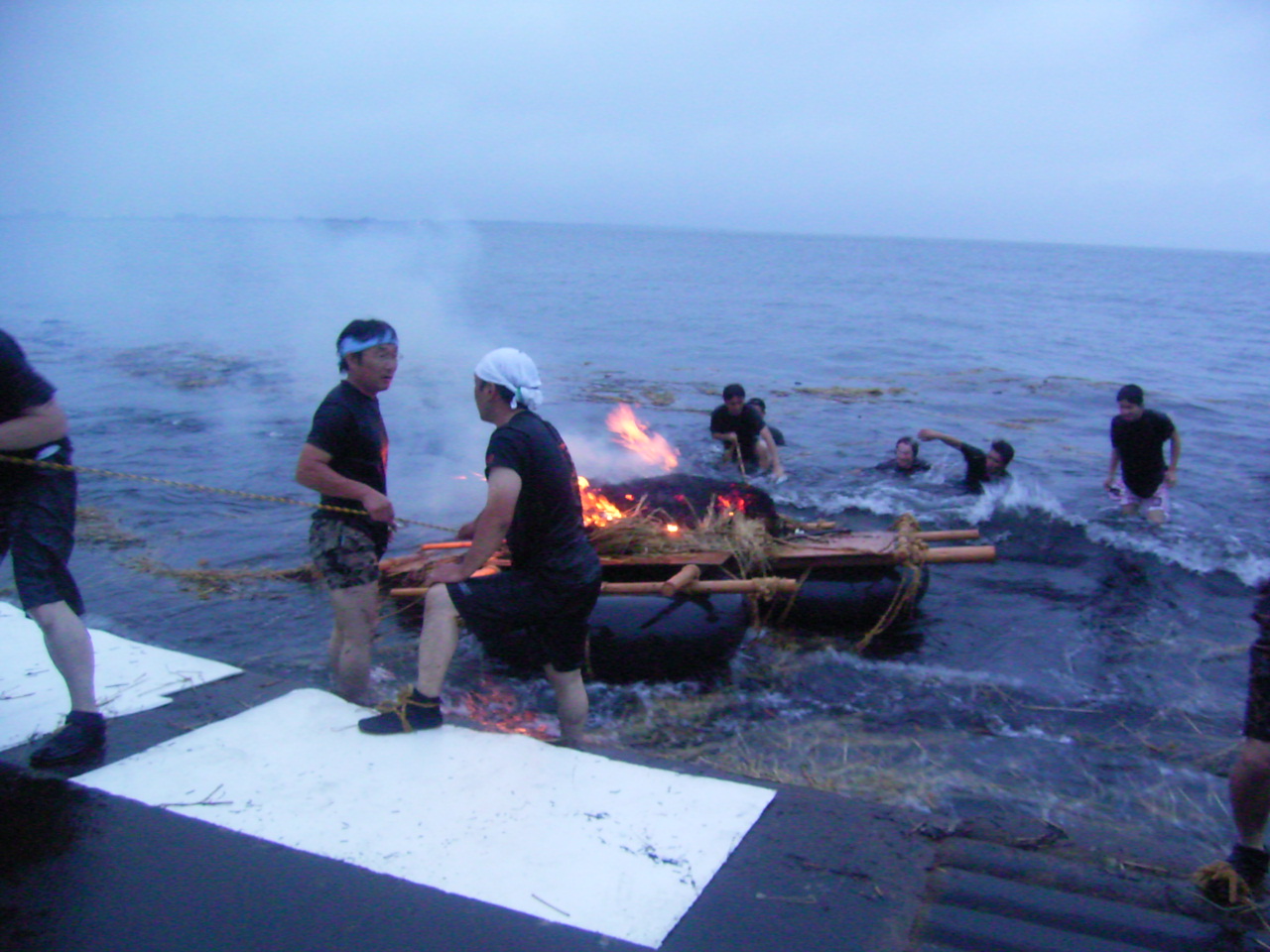 我々の「ねぶた」は、荒波のために点火前に4つの浮輪のうち1つが破損、前途多難な雰囲気を醸し出しながら、点火し沖へ。私の娘をはじめメンバーの子供も保護者の責任で一緒に海に入る。(残念ながら私の娘は途中リタイヤしたが。。。)