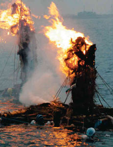 富山湾で大松明(たいまつ)を燃やす富山県滑川市の伝統行事「ネブタ流し」が三十一日夕、同市の和田の浜であり、燃え上がった大松明の炎が海を染めた。