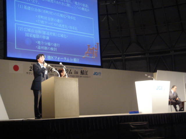 フォーラム2では、「地域の力」探求事業活動報告を行ったあと、講演会にうつる。講師には江口克彦氏(PHP総合研究所代表取締役、内閣官房道州制ビジョン懇談会座長)をお招きし「20XX年、北陸信越はこうなる!~国民を元気にする国のかたち」をテーマに講演された。