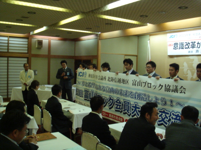 例会終了後、富山ブロック協議会より野村副会長、黒川議長、野村委員長はじめとする「富山ブロック会員大会」のキャラバンが来場。最後に副会長として出向している上田監事より参加のお願いもあった。