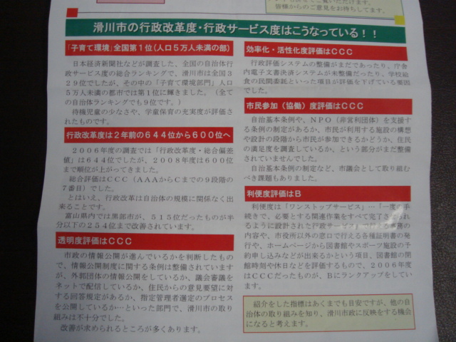 いわゆる滑川市議会議員としての活動報告であるが、読むと「滑川市の行政改革度・行政サービス度はこうなっている!!」と見出しがあった。内容は次のとおりである。