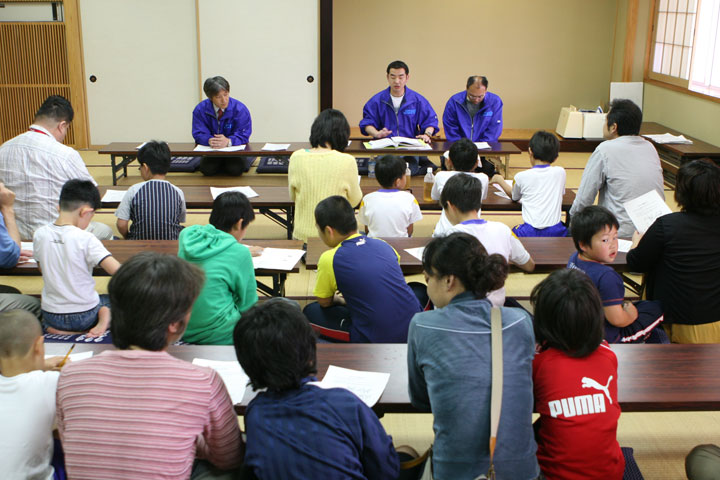 説明会終了後、着替えて土俵で練習会。初めて土俵を踏む子もいてぎこちない姿が初々しい。慣れた子や昨年度出場した子は成長したのがわかる。この事業は、年々成長する姿が見れる。それぞれ体の使い方を練習し、そしてメンバーは準備を万全にして来週5月31日日曜日の第16回わんぱく相撲ほたるいか場所大会当日に臨む。