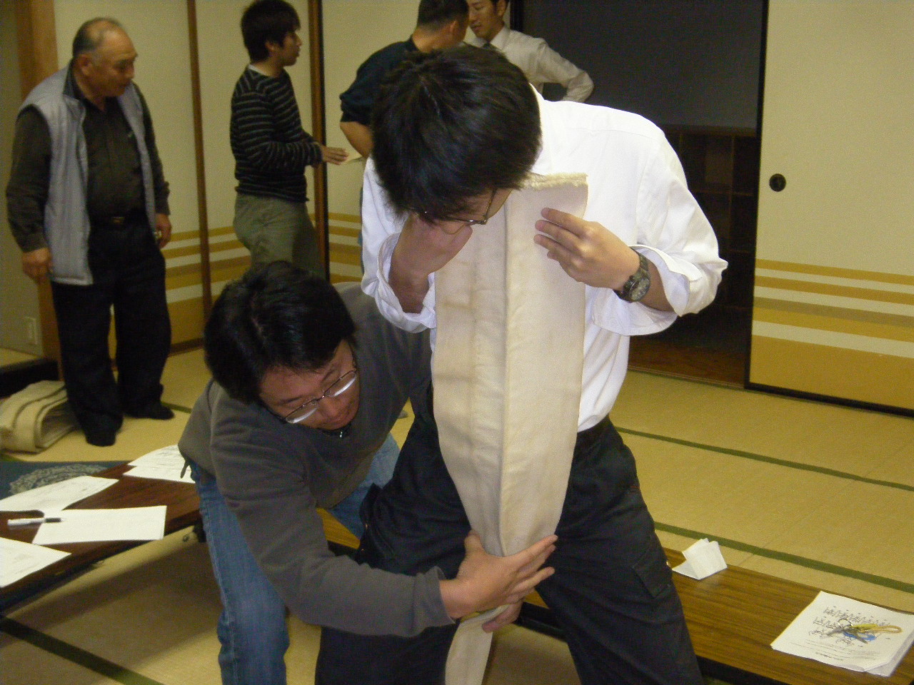 会議終了後、運営上必要なまわしの締め方の講習会を行いました。相撲連盟(メンバーも在籍しています)や経験者の指導のもと初心者を中心にまわしを実際に締めてみました。